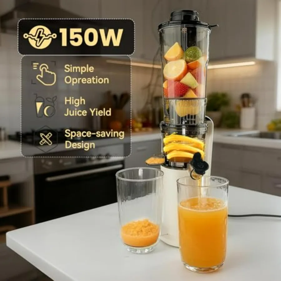 Cold Press Juicer, 3.1 Inch Juicer Machines, 150W Masticating Slow Juicer, Juice Machine for Vegetables and Fruits, Easy to Clean Juicers, High Juice Yield, Offwhite
